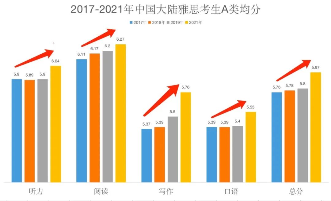 ![]() 2021年中国大陆雅思考生表现 2021年,A类(学术类)的总分均分为5.97分,相比于2019年上升了0.17分。所有科目都有所提升。 其中,A类写作分数进步最大,均分为5.76分,相较于2019年提高了0.26分。听力均分也终于突破了6分线,从2019年的5.9分提升到了2021年的6.04分。口语比前些年也有所提升!并且从A类雅思口语单项均分来看,我们的排名也不再是40个国家和地区里的倒数第一名了,排到了第38位。