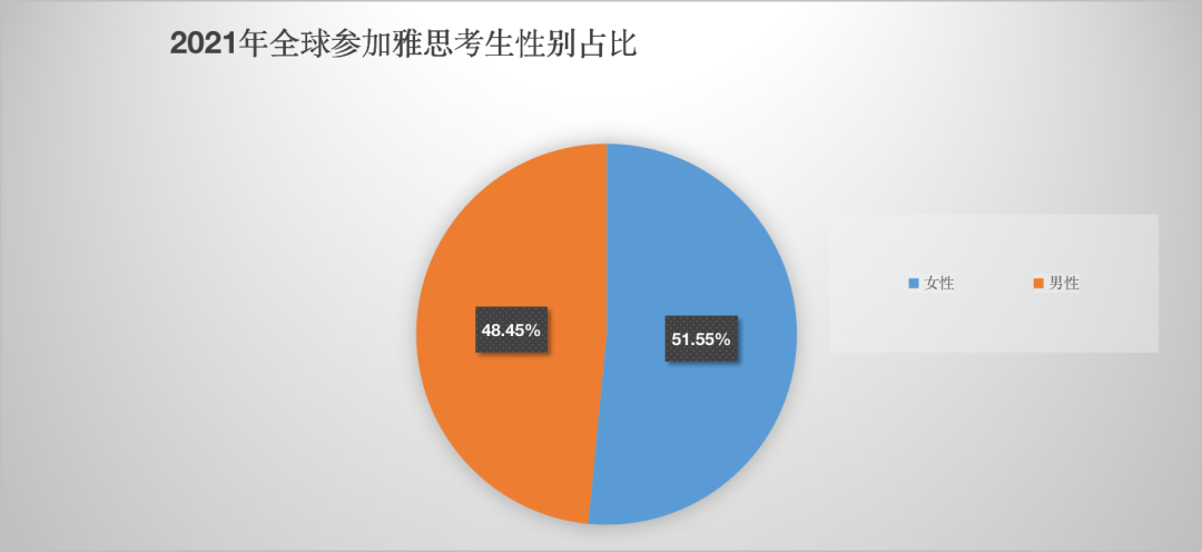 02 考生性别占比 在所有参加雅思考试的考生中,女考生占比达51.55%,而男考生占比为48.45%。女考生数量依然略多于男考生。