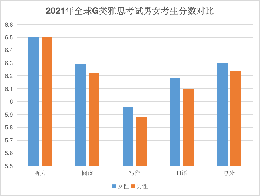 G类雅思考试数据看,和A类相同,女生的总分均分为6.62,而男生的总分均分则为6.51。