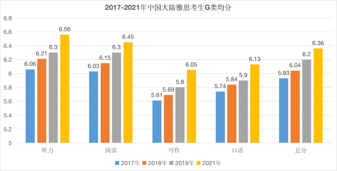 G类雅思考试总分均分为6.36分,不仅比A类均分高出不少,也比2019年总分均分上升了0.16分。单项提升最明显的则是听力,均分为6.56分,相较于2019年提高0.26分。其它单项均有不同程度的提高,写作和口语均分也都达到了6分以上。