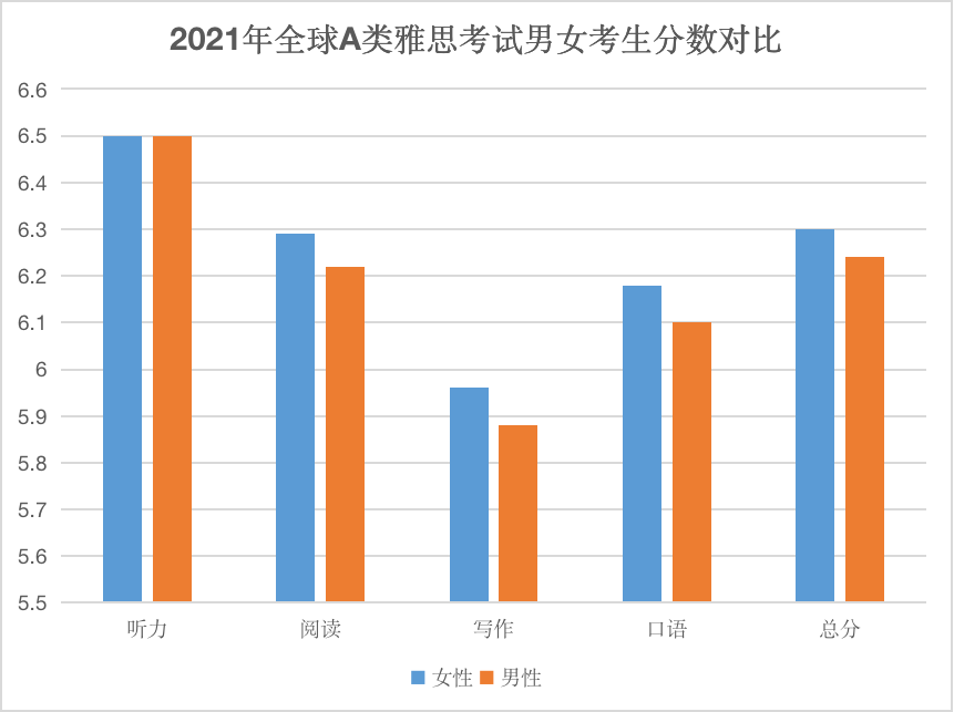 03 考试表现 从考试表现的数据上看,2021年女生整体表现比男性考生略好。 A类雅思考试中,女生的总分均分为6.3,而男生的总分均分仅有6.24。