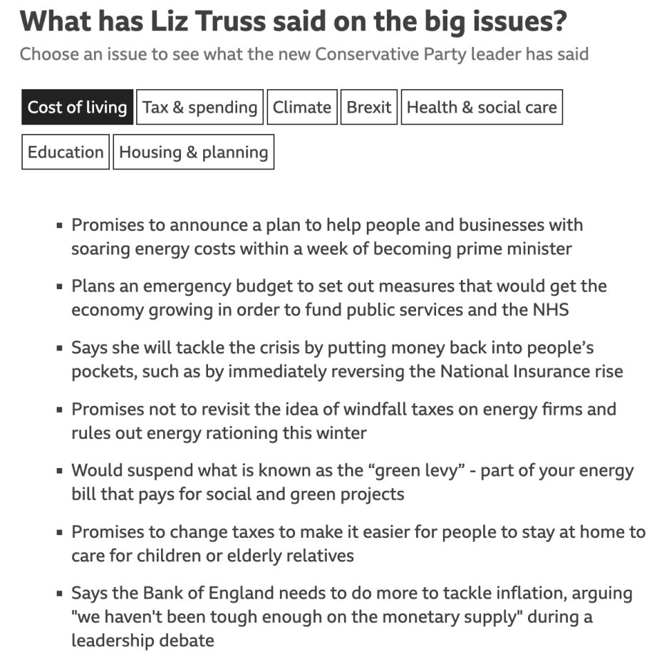 自7月7日鲍里斯卸任首相的两个月以来,一直没有处理生活成本危机的烂摊子。政权真空状态下的英国,8月末时的通胀率达到10.1%,创40年来新高;能源价格上限暴涨80%;食品价格以14年来最快速度增长…作为新上任的英国首相,特拉斯面临着生活成本危机、经济衰退与工业动荡三个棘手事项。如何解决社会与经济的巨大压力,帮助人们减轻生活成本负担、重振英国经济,是她必须接管的巨大挑战。资深保守党议员认为,特拉斯面临的挑战仅次于撒切尔夫人。