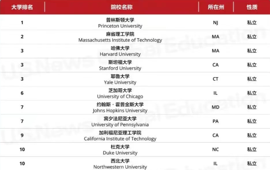 哥大跌出TOP 10 普林斯顿大学连续12年蝉联全美大学之首 普林斯顿大学连续12年蝉联第一;麻省理工大学从2022年排名中的第4位,上升至第2位;斯坦福大学也重回TOP 3行列,与哈佛大学、耶鲁并列第3位;约翰斯霍普金斯大学从第9位,上升至第7位,与宾大并齐。